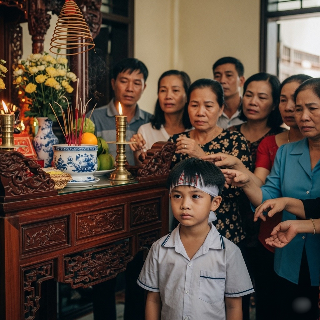 Cuộc họp gia đình diễn ra chóng vánh trong sự phẫn nộ. Anh Tuấn không nói một lời, anh đứng dậy, đấm mạnh vào tường rồi bỏ ra sân ngồi bất động. Bà nội và các cô chú quyết định rất nhanh: Phải đưa thằng bé đi. Trại mồ côi hay gửi vào chùa, đâu cũng được, miễn là nó biến mất khỏi ngôi nhà này để xóa sạch nỗi nhục nhã mà chị Hồng để lại.
