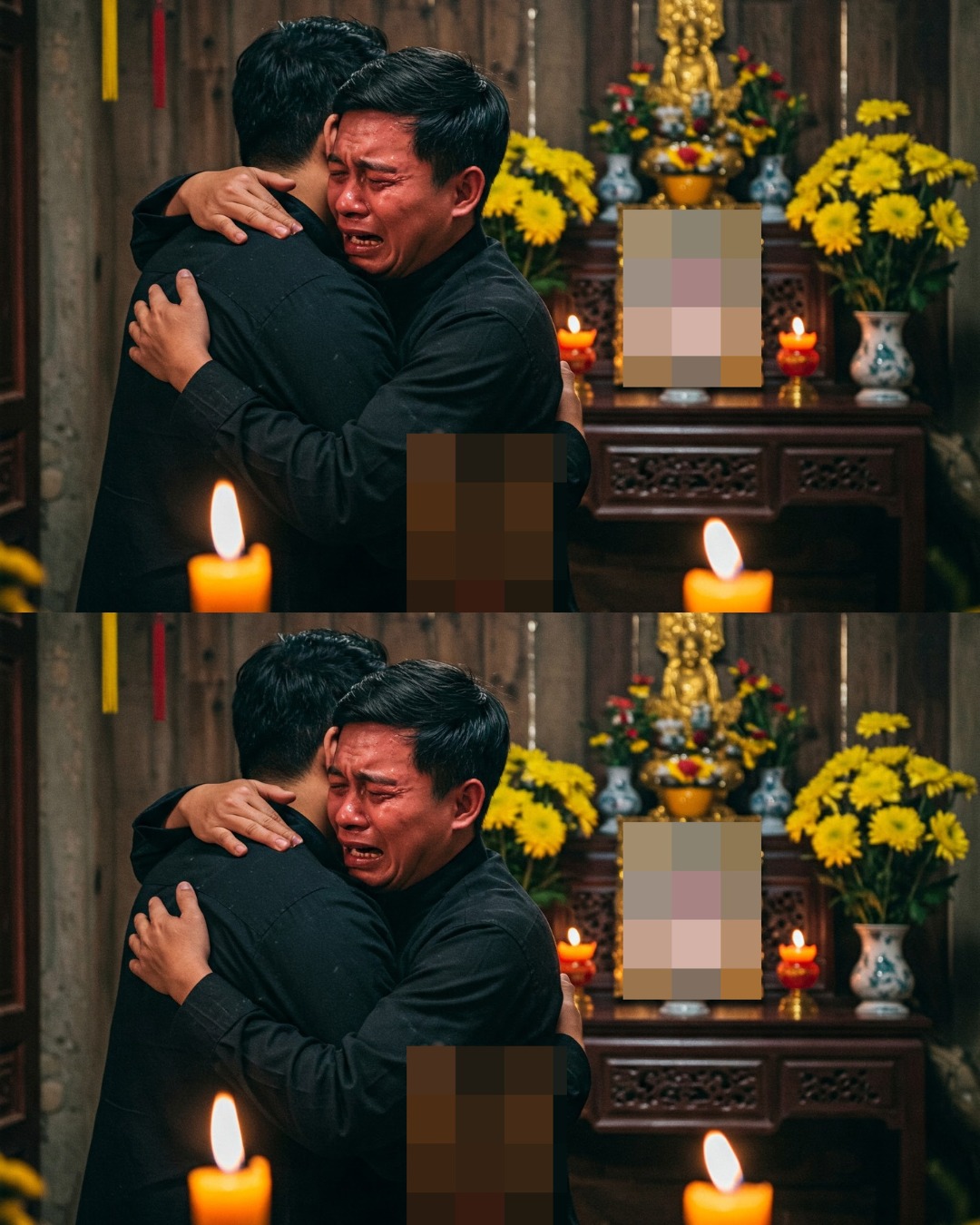 Tuấn mời ông Hùng vào nhà. Khi bước vào phòng khách, ông Hùng chợt khựng lại. Trên bàn làm việc nhỏ đặt ở góc phòng, một bức ảnh đen trắng được hiển thị rõ ràng. Trong ảnh là một người phụ nữ lớn tuổi, có vẻ mặt hiền hậu nhưng ánh mắt đầy u buồn. Bên cạnh tấm ảnh là bát hương còn nghi ngút khói, vài cây nhang đang cháy và một bình hoa tươi. Ông Hùng cảm thấy tim mình như thắt lại. Ông quay sang Tuấn, giọng lạc đi: