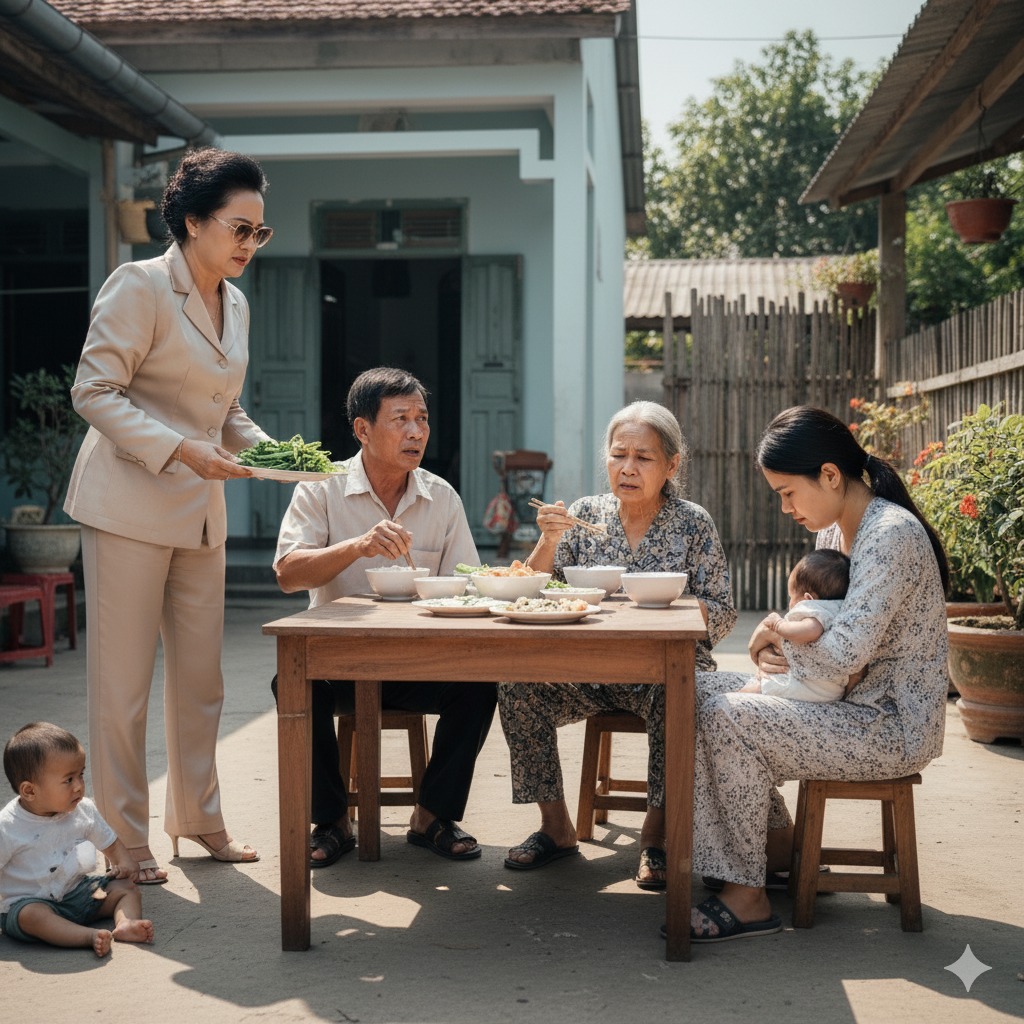 Bữa cơm đón bà hôm ấy, bố mẹ chồng tôi – ông Pao và bà Lành – mang ra đúng một đĩa rau dớn rừng xào tóp mỡ, thêm bát canh đắng. Mẹ tôi ngồi nhìn, mặt hơi sượng lại. Bà cầm đũa chấm cho có, nhai vài miếng rồi buông đũa, cổ nghẹn ứ, mắt rơm rớm.